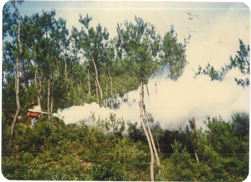 ▲研制的3Y-35型烟雾机在嵊县开展松毛虫防治(1986)