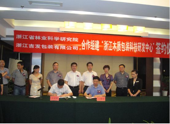 2014年8月21日上午,我院与浙江吉发包装有限公司合作组建“浙江木质包装科技研发中心”签约仪式在天台县隆重举行。签约仪式上,浙江吉发包装有限公司许式荣总经理与我院汪奎宏院长签订了“意向书”,并就具体合作事项进行了讨论。浙江天台县委副书记县长徐淼、县委副县长徐海彪、县委副主席齐显移,县科技局陈霞飞等县领导,我院竹类所李琴所长,王洪艳博士出席了签约仪式。